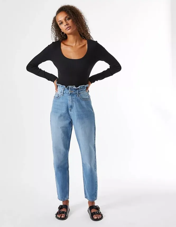 Бананы – один из самых популярных фасонов джинсов. Девушки любят их за то, что они выгодно подчеркивают талию, помогают визуально удлинить ноги и скрыть недостатки в области бедер, ягодиц и живота. В этом сезоне стоит обратить внимание на модели как с классическим поясом, так и с талией paperbag.