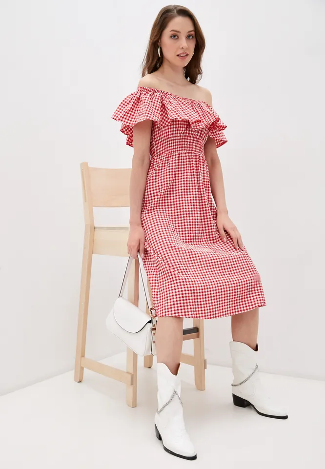 Универсальный вариант на каждый день — платье в стиле кантри с крупной оборкой на груди. Мы выбрали вариант модного оттенка с актуальным летним принтом — клеткой «виши».