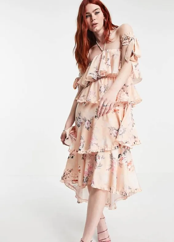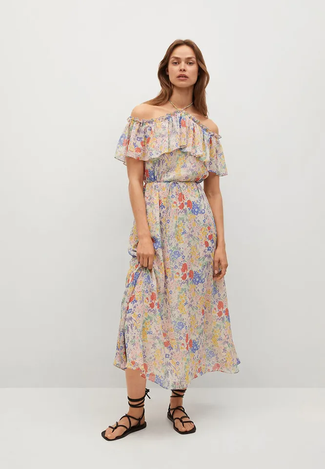 Создать романтичный образ поможет ярусное платье с ниспадающими оборками и ненавязчивым цветочным принтом. Мы дополнили бы его белыми босоножками и миниатюрной сумочкой.