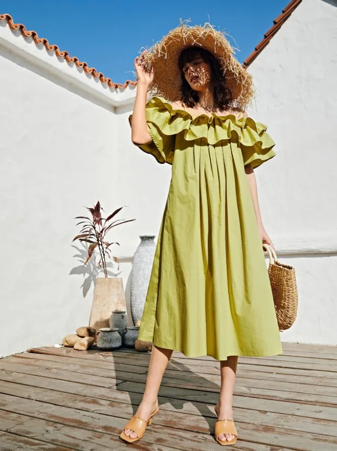 Тем, кто предпочитает оверсайз, стоит обратить внимание на свободное оливковое платье с объемными оборками. Его органично дополнят соломенная шляпа и эспадрильи с завязками.