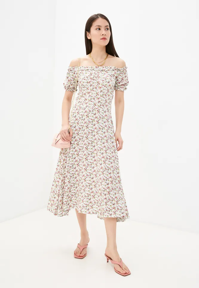 Мастхэв сезона — романтичное платье миди в мелкий цветочек.