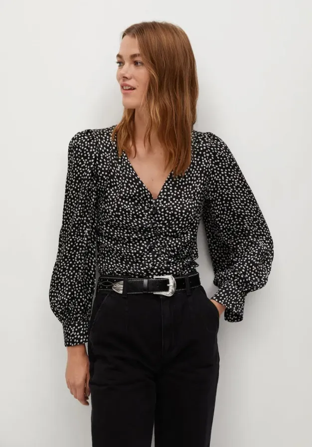 V-образный вырез, чуть объемные рукава, сборки спереди — такая блуза не только сделает грудь более округлой и аккуратной, но и визуально удлинит шею и подчеркнет ключицы. Для усиления эффекта носи ее с брюками, джинсами и юбками на очень высокой посадке и дополняй ансамбль ремнем.