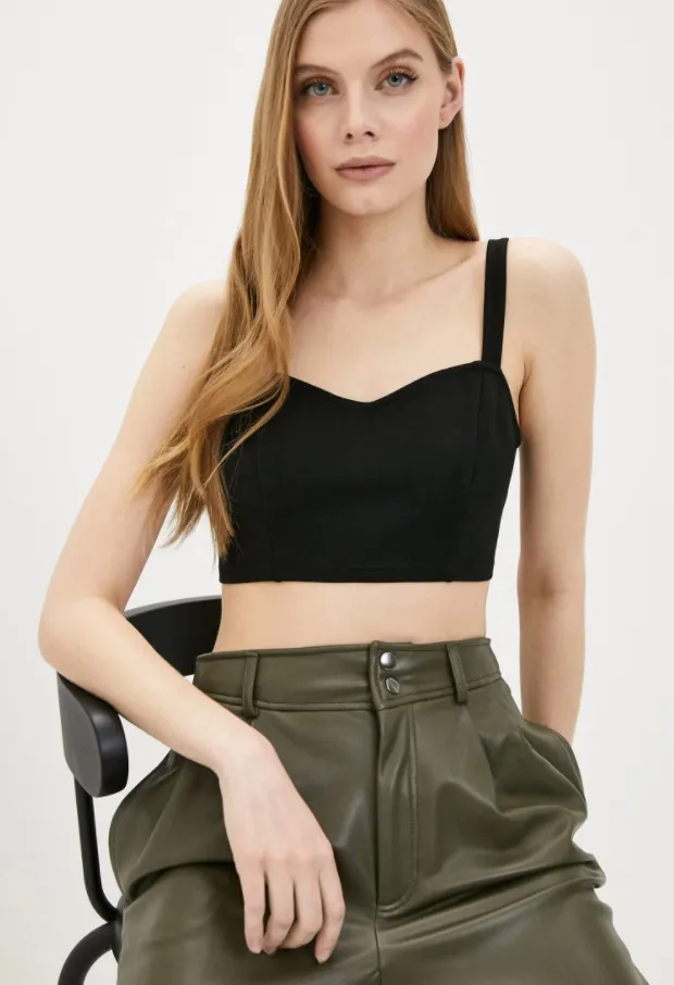 Такой кроп-топ предлагаем носить под пиджаки и брючные костюмы. Он сделает ненавязчивый акцент на груди и добавит образу изюминку.
