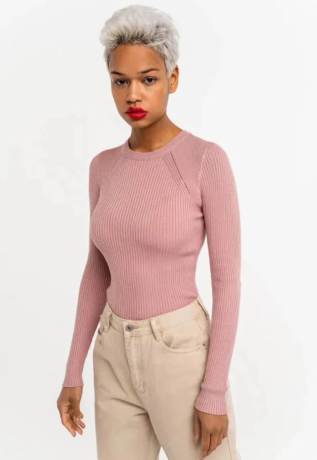 Джемпер в рубчик из плотного трикотажа поможет подчеркнуть бюст и сгладит недостатки в области живота, спины и боков. Однако есть одно «но»: под него нужно подобрать правильный бюстгальтер, который подтянет грудь и придаст ей желаемую форму.