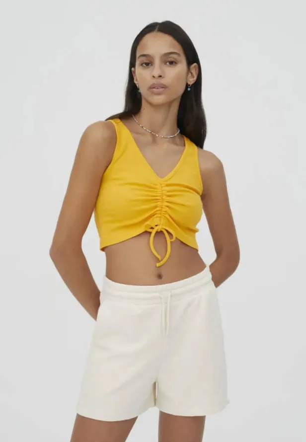 Добавить яркий акцент в повседневный образ поможет желтый топ со сборками на груди. Предлагаем носить его с брючными костюмами весной, а летом — с шортами и легкими рубашками.
