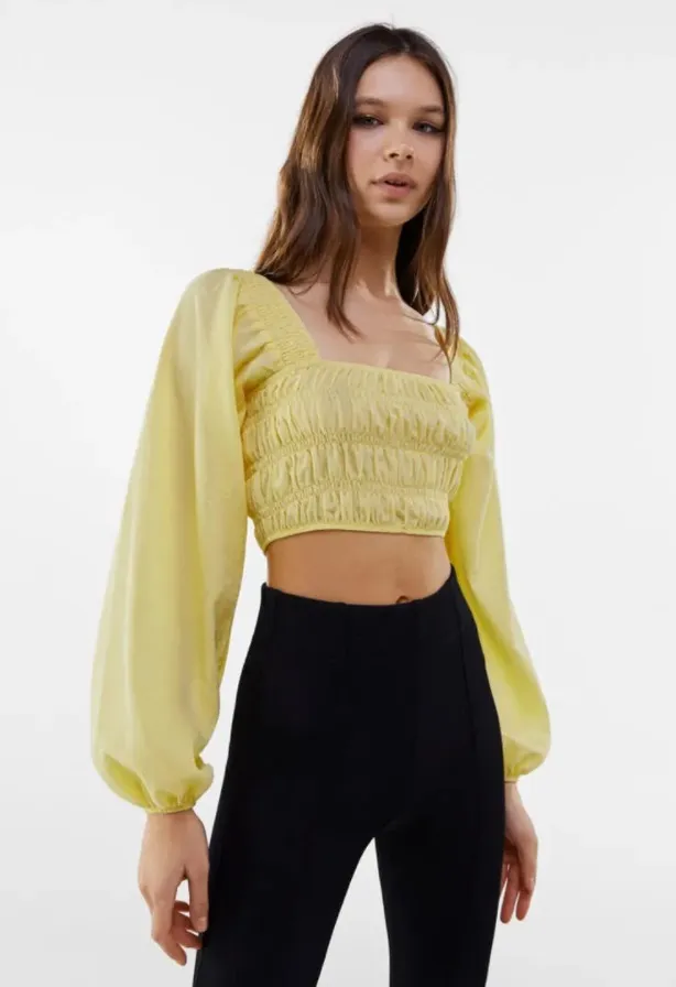 Романтичный желтый топ с воздушными рукавами можно надевать с кожаными мини-юбками, широкими брюками на высокой талии или модными в этом сезоне джинсами-трубами.