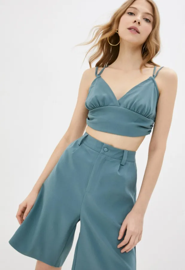 Фактурный бирюзовый топ на двойных бретелях будет стильно смотреться с брюками или шортами в тон. Дополни его изящным кулоном на тонкой цепочке, чтобы подчеркнуть длинную шею и ключицы.