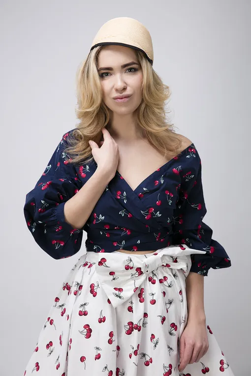 Кто из нас не любит путешествовать?! И я, конечно, тоже периодически нуждаюсь в «смене картинки». Совсем недавно я была в солнечной зеленой Италии. Этот романтичный образ вдохновлен той самой поездкой. Укороченный топ с объемными рукавами и бантом и юбку–солнце из хлопка с сочными вишенками я дополняю оригинальной и забавной соломенной шляпкой.