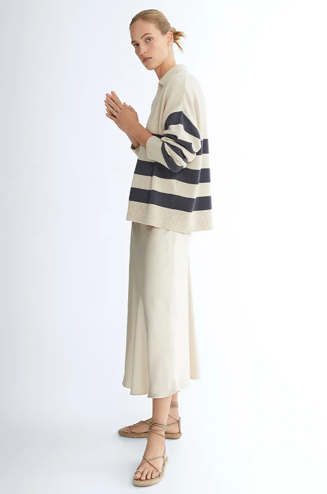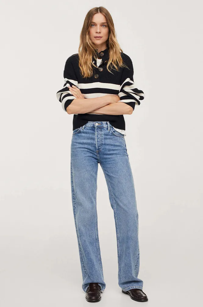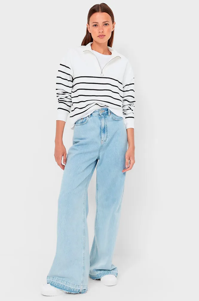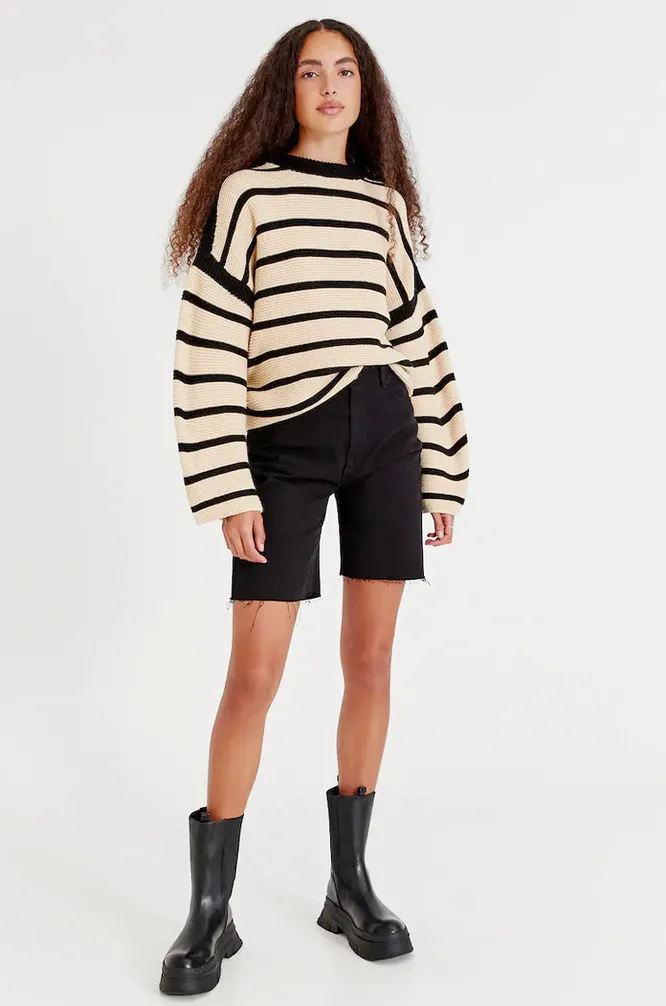 Свободный джемпер в полоску с расширяющимися от середины плеча рукавами — отличный вариант на каждый день. Надевай его с джинсами и кожаными брюками, комбинируй с трикотажными джоггерами и элегантными палаццо. Такую модель лучше носить навыпуск — аккуратно заправить длинный и плотный край джемпера за пояс проблематично.