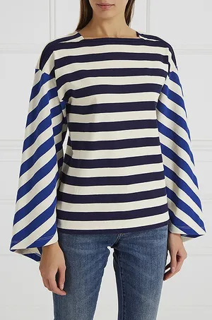 Классическую тельняшку с длинным рукавом можно носить в офис с брюками и удлиненным оверсайз-жакетом. Добавь к образу черный картуз, сумку на длинной цепочке и туфли kitten heels — образ парижанки тебе точно понравится!