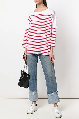 Удлиненный топ с красными полосками — стильный вариант для прогулки по парку. Надень его с джинсами с необработанным краем или с белыми скинни.