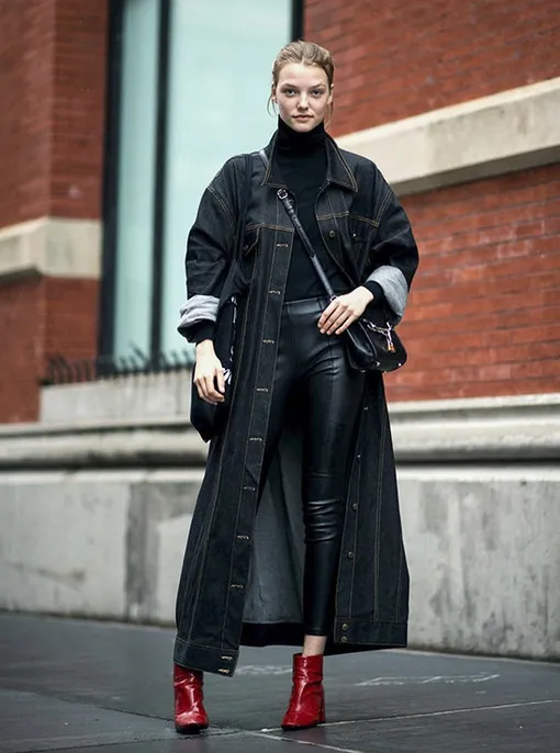 Выигрышное сочетание разных фактур станет изюминкой твоего осеннего образа. Попробуй примерить темное джинсовое пальто и кожаные скинни или леггинсы – да, это непривычно и даже дерзко, но зато как красиво!