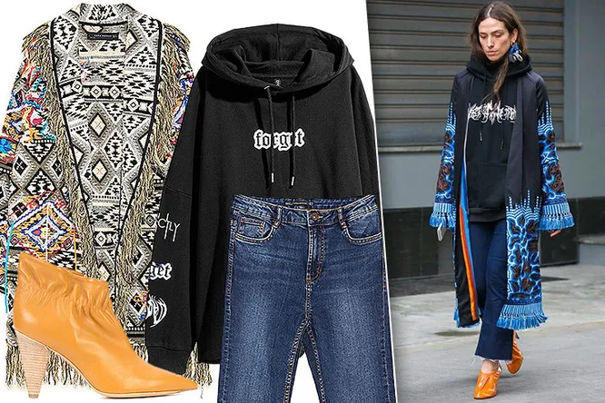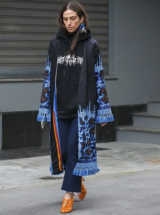 Надень шикарное пальто с бахромой и вышивкой, расклешенные джинсы с бахромой, максимально яркую обувь и добавь что-то неожиданное, например, спортивную толстовку с надписями – город будет покорен!