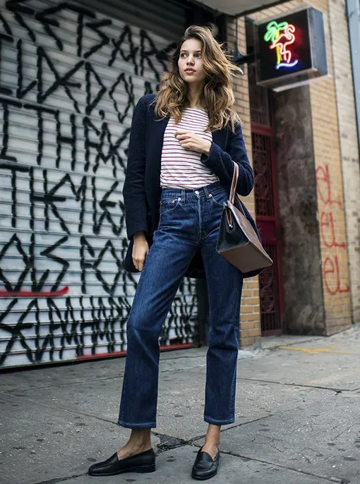 Дополни их футболкой в полоску, коротким пальто-букле либо шерстяным пиджаком, сумкой средних размеров и черными лоферами.