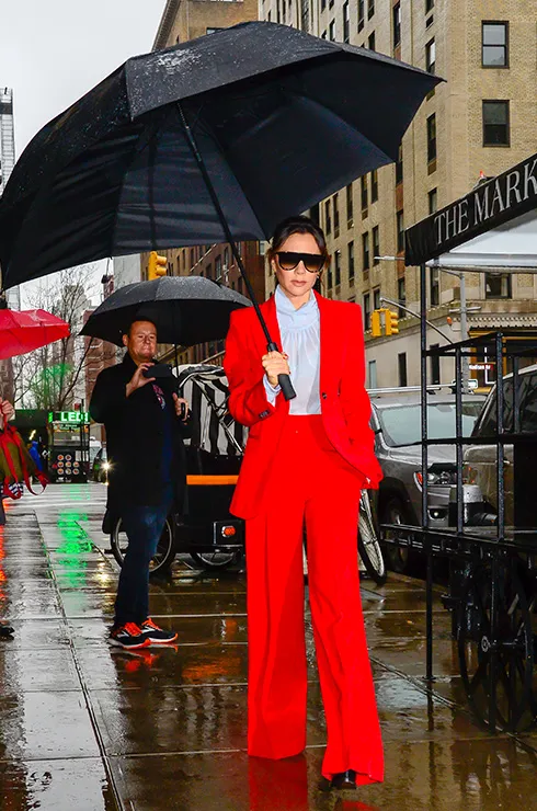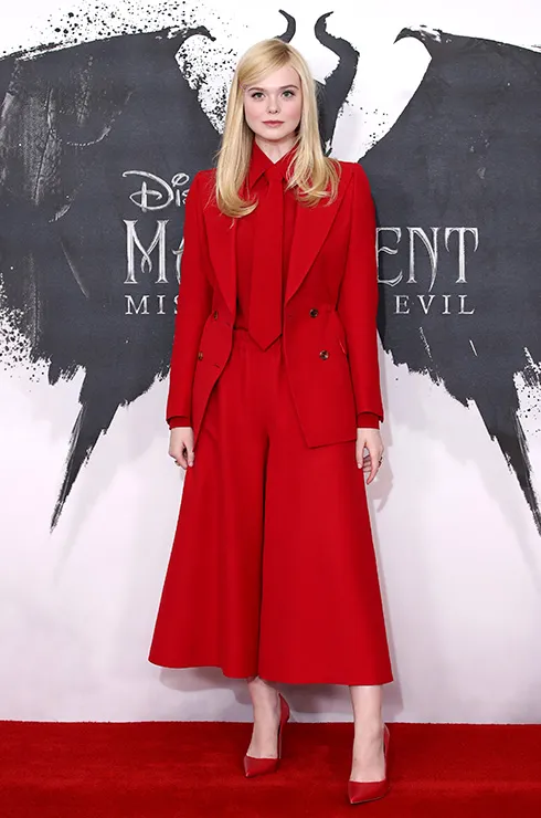 В красном брючном костюме невозможно остаться незамеченной, поэтому он подойдёт женщинам, которых сложно смутить всеобщим вниманием. Если вы из таких, вдохновляйтесь образом Виктории Бэкхем. Она, как никто другой, умеет носить трендовые вещи. Даже в дождливом мегаполисе алый наряд не позволит поддаться тоске. Юная актриса Эль Фэннинг появилась в красном брючном костюме на премьере фильма «Малефисента: владычица тьмы». Её выбор пал на интересную модель с брюками-кюлотами и галстуком.