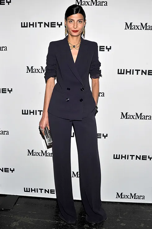 Тёмный оттенок синего, получивший название «флотского» (navy blue), является одним из самых востребованных в классическом гардеробе. Это прекрасно знает топ-модель Даутцен Крёз. Посмотрите, какой стильный фасон у её наряда – непринуждённый, слегка свободный, с узкими лацканами. В таком брючном костюме хрупкая женская фигура будет казаться ещё тоньше. Модный редактор и любимица streetstyle-фотографов Джованна Батталья носит синий брючный костюм, подвернув рукава жакета. Этот трюк позволяет сделать силуэт более изящным, а также невзначай похвастаться красивыми часами и браслетами. Итальянка, впрочем, предпочитает гарнитур из роскошного ожерелья, серёг и кольца, а также сверкающий клатч.