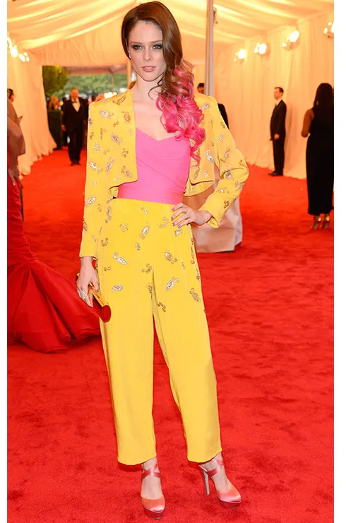 Когда в 60-е Ив Сен-Лоран представил публике женский вечерний брючный костюм Le Smoking, мир моды разделился на до и после – женский смокинг стал классикой вечернего гардероба и является таковым до сих пор. Знаменитости для своих эффектных выходов также выбирают необычные, яркие костюмы с принтами и декором. Певица и танцовщица FKA Twigs с удовольствием носит винтажный костюм Christian Dior by John Galliano из золотистой ткани с цветочным орнаментом и жемчужинами. Модель Коко Роша предпочитает жёлтый нарядный брючный костюм, украшенный блестящими аппликациями, и сочетает его с неоново-розовым топом.