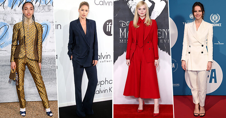 Когда в 60-е Ив Сен-Лоран представил публике женский вечерний брючный костюм Le Smoking, мир моды разделился на до и после – женский смокинг стал классикой вечернего гардероба и является таковым до сих пор. Знаменитости для своих эффектных выходов также выбирают необычные, яркие костюмы с принтами и декором. Певица и танцовщица FKA Twigs с удовольствием носит винтажный костюм Christian Dior by John Galliano из золотистой ткани с цветочным орнаментом и жемчужинами. Модель Коко Роша предпочитает жёлтый нарядный брючный костюм, украшенный блестящими аппликациями, и сочетает его с неоново-розовым топом.