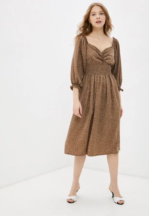 Если хочешь подчеркнуть талию и грудь, выбирай это платье. Мелкий горошек, вырез сердечком, драпировка и оборки — платье идеально подойдет для женственных образов.