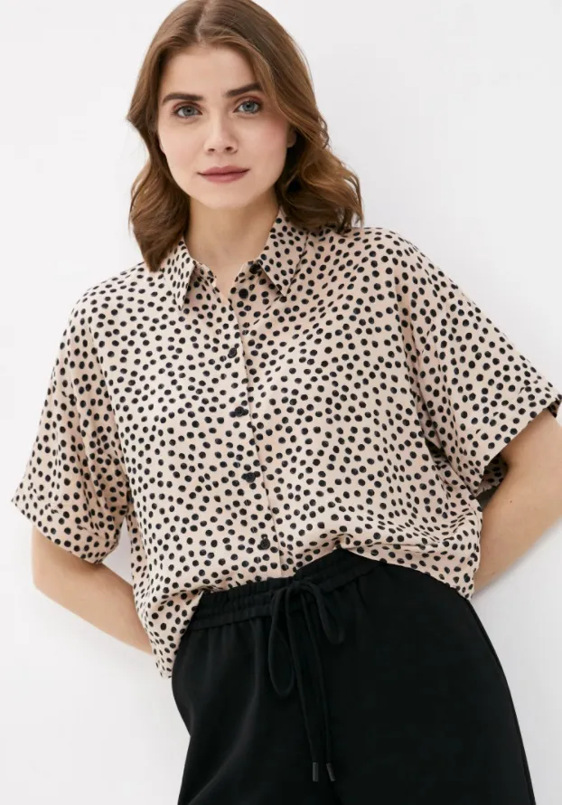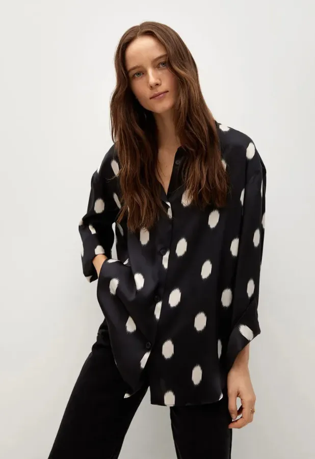 Расслабленная блуза из атласной ткани в крупный горох станет отличной основой для элегантных образов. Носи ее с широкими брюками и лоферами или белыми джинсами и однотонными городскими кроссовками.
