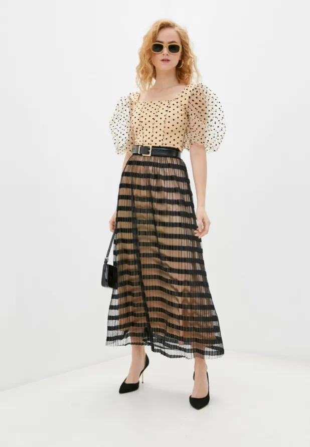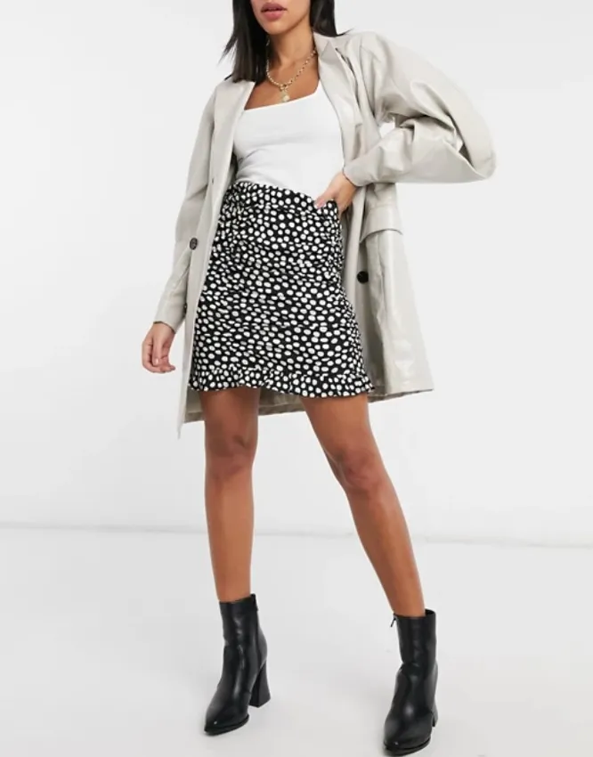 Мини-юбка в горошек со сборками круто смотрится в тандеме с акцентными ботильонами или массивными кроссовками, базовой футболкой и кожаной оверсайз-курткой.