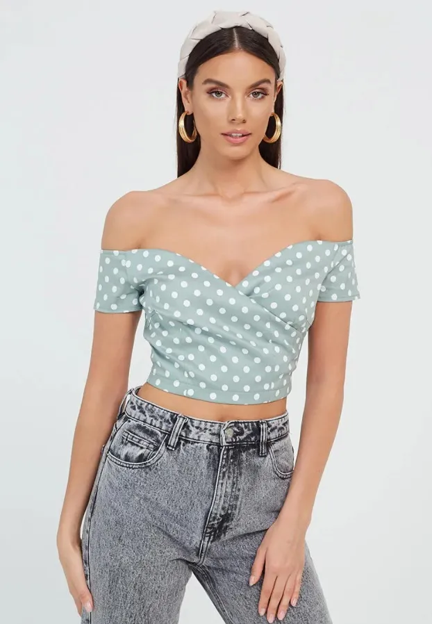 Укороченный топ с открытыми плечами подчеркнет грудь, изящные ключицы и визуально удлинит шею.
