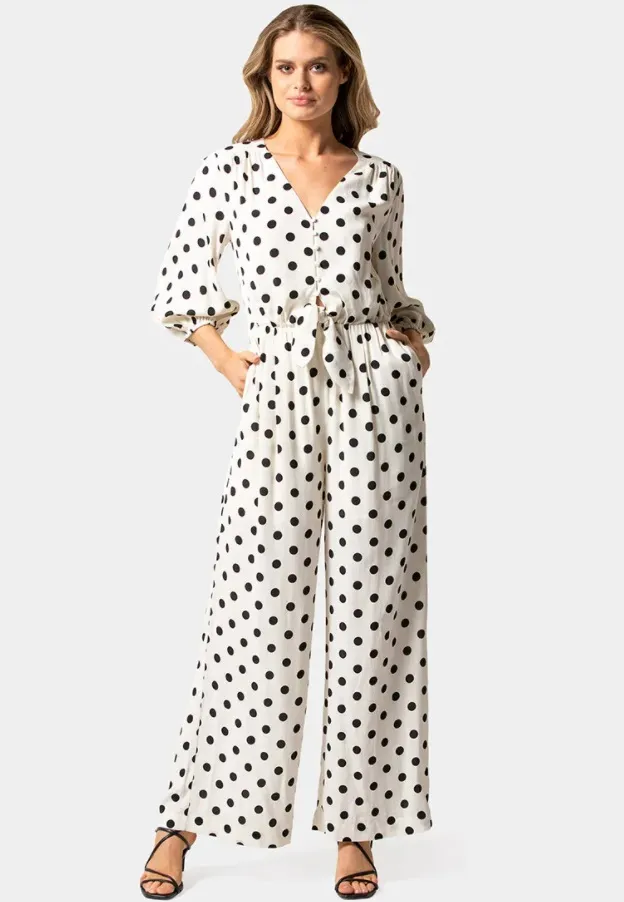 Белый комбинезон в черный горох — готовый наряд для вечеринки, свидания, театра или прогулки в парке. Подбирай аксессуары в зависимости от случая.