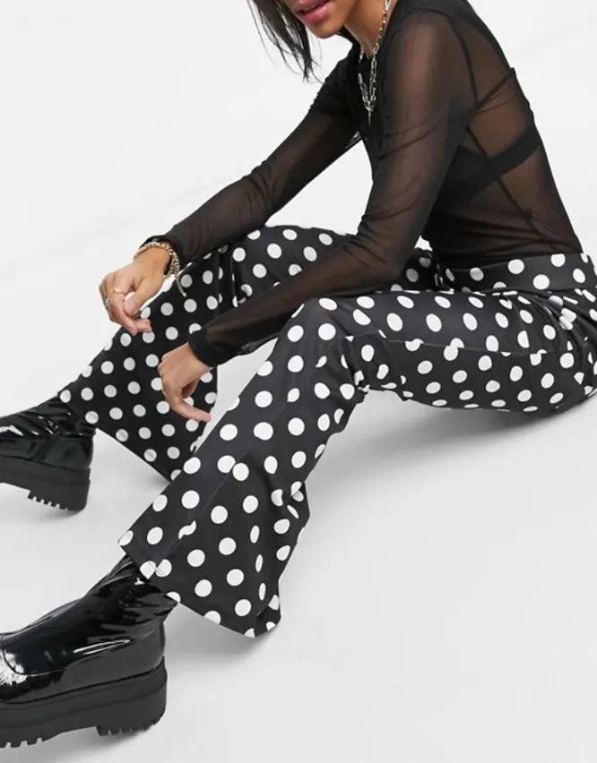 Брюки в горох советуем носить в составе монохромных образов, например с черным топом и белым пиджаком.