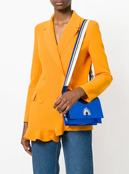 Синяя сумка с декором и широким ремешком выглядит очень стильно и дорого. Она непременно привлечет всеобщее внимание к своей обладательнице. Носи ее вместе с вещами контрастных цветов: оранжевый, белый и зеленый подойдут идеально.