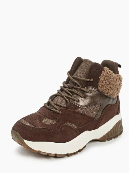 Комбинированные кроссовки спокойного коричневого оттенка – отличное дополнение к зимним casual-образам. Для создания расслабленного лука носи их с трикотажными или кожаными джоггерами, оверсайз-худи и объемными свитерами. В таком ансамбле можно отправиться на шопинг и поехать за город. На прогулки по городу и неформальные встречи надевай кроссовки с широкими джинсами, водолазкой и свободным кардиганом или жакетом мужского покроя. Эти высокие кроссовки достаточно нейтральные, имеют лаконичный дизайн, далекий от спортивного стиля, поэтому данную пару ты сможешь носить даже с юбками и платьями (желательно длины миди, мидакси или макси).