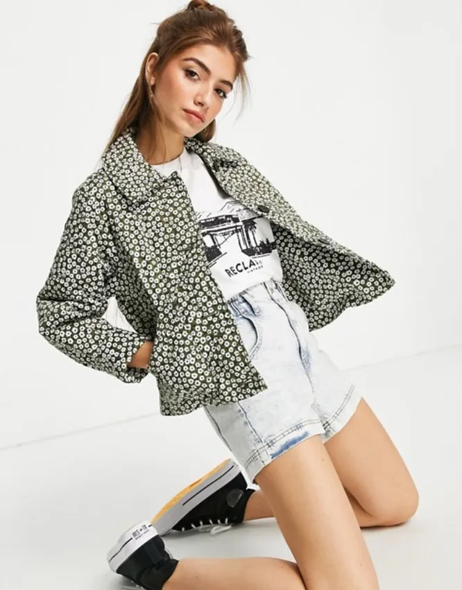 Поддержать романтичное весеннее настроение в образах поможет зеленая куртка с флористическим узором. Носи ее с лаконичными рубашками и джинсами, элегантными брюками и блузками.