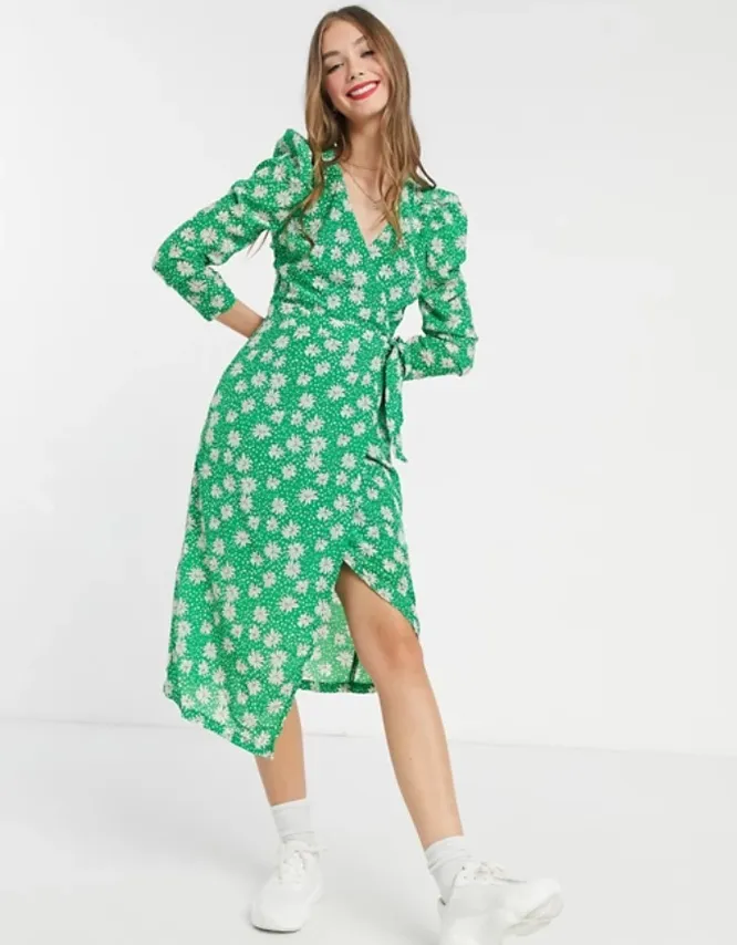 Яркое зеленое платье с запахом подчеркнет достоинства фигуры, обозначит талию и визуально удлинит шею. Носи его с белыми кедами и плетеной сумкой.