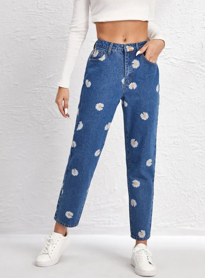 Поклонницам интересных и оригинальный вещей предлагаем присмотреться к джинсам с цветочными паттернами. Дополни их кроп-топом, оверсайз-рубашкой или коротким кардиганом.