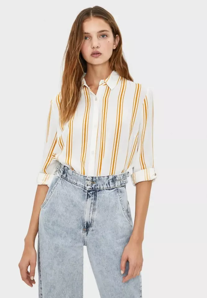 Задать настроение помогут полоски яркого оттенка. Нам пришлась по вкусу белая рубашка с широкими желтыми линиями. Несмотря на довольно броский цвет полосок, такая модель довольно универсальная и будет одинаково гармонично смотреться с повседневными джинсами, строгими костюмами и цветными юбками.