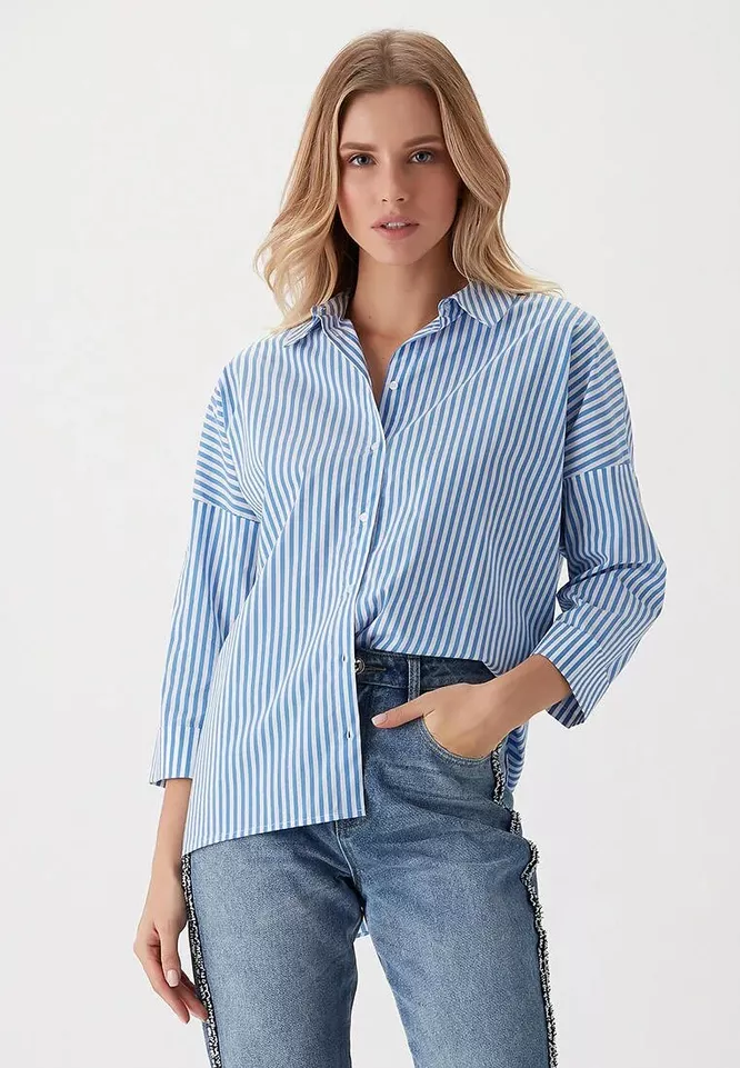 Объемную рубашку в голубую полоску можно носить как на голое тело, так и использовать в качестве верхнего слоя на майку, футболку или топ. Она круто смотрится с джинсами, сочетается с легкими платьями кукольного кроя и летящими юбками миди.
