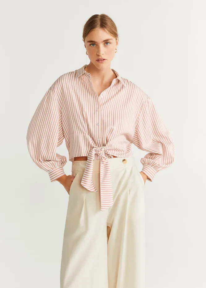 Очень эффектно будет смотреться объемная рубашка в полоску с завязкой на поясе. Такой прием позволяет слегка открыть живот и тем самым подчеркнуть талию. Выбирай низ с достаточно высокой посадкой, чтобы промежуток до рубашки был не слишком большим — важно показать лишь маленький кусочек тела.