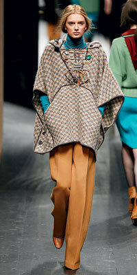 В моде все вариации на тему русского салопа – широкой накидки с прорезями для рук – или капы (oт английского cape) – застегивающегося на шее плаща-пончо, часто с капюшоном, пришедшего к нам из средневековой Европы. Короткие модели хорошо смотрятся с юбками.