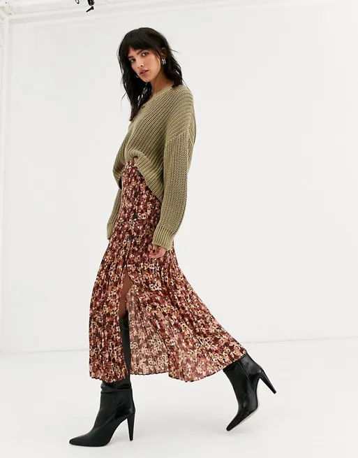 Цветочную юбку-макси лучше всего носить со свитером нейтральной расцветки: идеально подойдут модели в бежевой гамме, хаки, черные или белые. Слегка заправь край свитера за пояс, чтобы добавить образу легкой небрежности, и дополни композицию высокими сапогами или казаками.