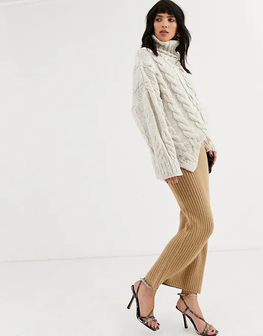 Еще один интересный вариант на каждый день. Если ты хочешь выделяться на фоне окружающих, советуем добавить в свой привычный образ больше света, ведь с наступлением холодов многие переодеваются во все черное. Выбирай в качестве базы трикотажную юбку в рубчик бежевой расцветки и сочетай ее с бабушкиным свитером в косичку. Из обуви подойдет что-то лаконичное, вроде кожаных ботильонов kitten heels или классических сапог с широким голенищем.