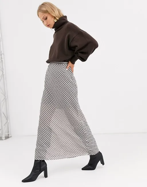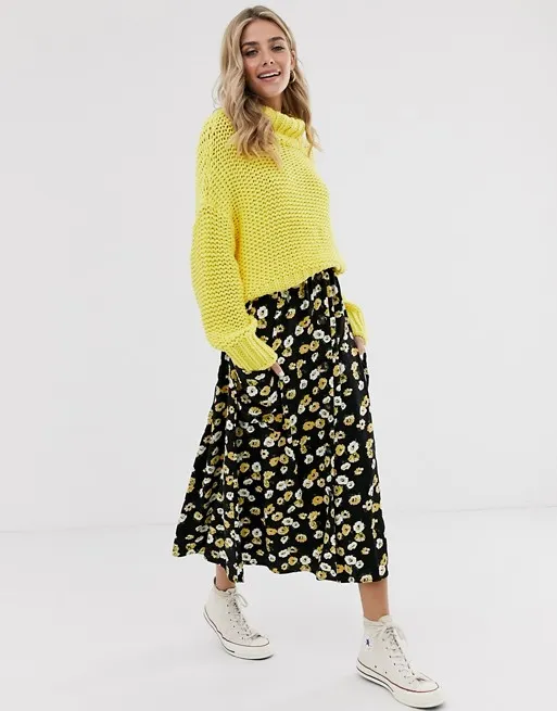 С этой юбкой ты легко составишь яркий теплый образ. Модель черного цвета в желтую ромашку подружится с объемным кислотным свитером крупной вязки. Идеальным дополнением к наряду послужат массивные кроссовки в тон или ботильоны на блочном каблуке.