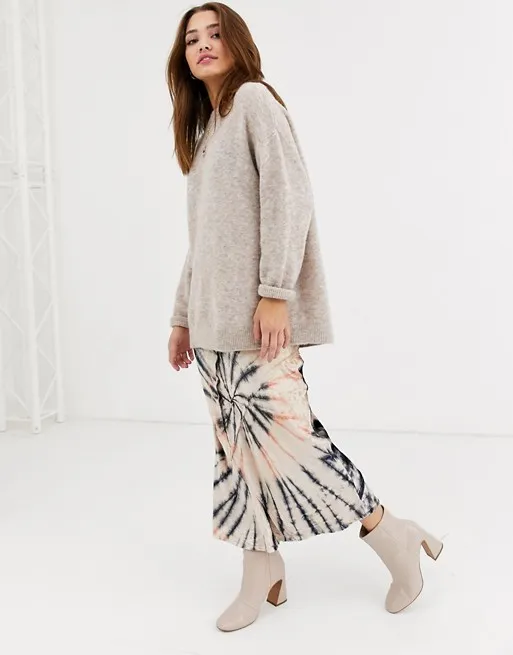 Необычная модель юбки с модным в этом году принтом тай-дай. Носи ее с однотонным свитером спокойной расцветки: подойдут как нейтральные бежевые, серые, черные, так и более яркие пастельные.