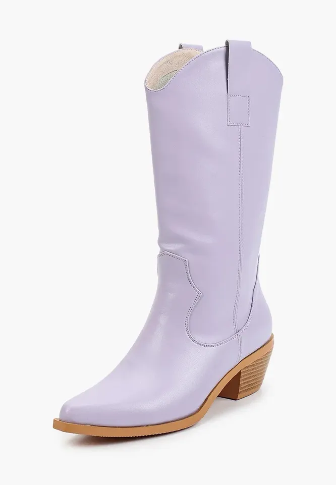 А на замену привычным сапогам подойдут казаки фиолетового оттенка – для создания интересных и запоминающихся луков. Можно носить их с платьями и юбками или заправлять в них свободные брюки, чтобы образ получился фактурным и динамичным.