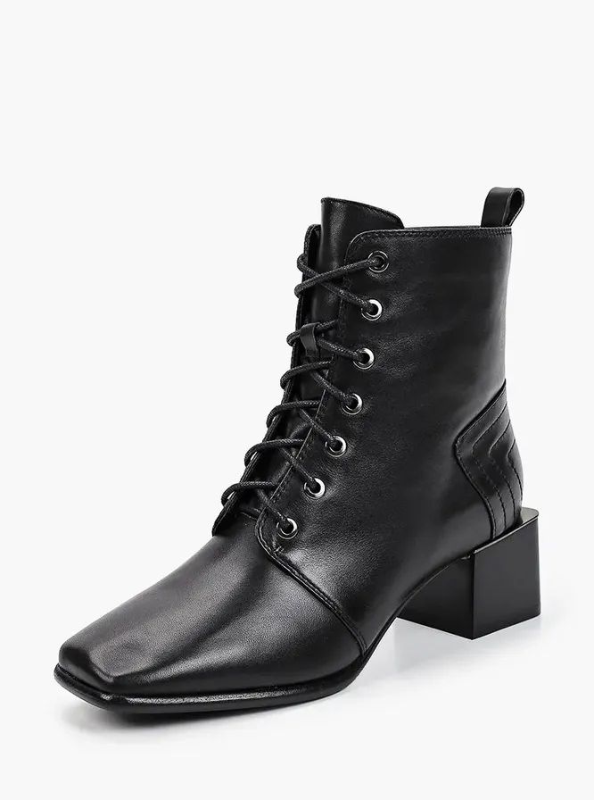 Казаки из фактурной кожи с зауженным квадратным носом. Узкое голенище визуально будет стройнить ноги и в целом вытягивать силуэт. Ботильоны идеально подойдут к любому платью или юбке.