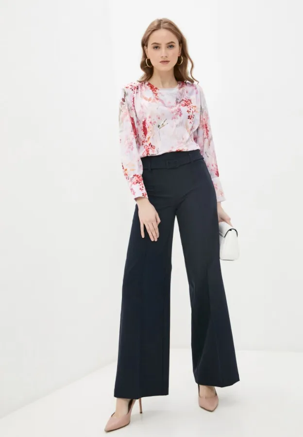 Для элегантных деловых образов подойдут широкие брюки клеш, акцентирующие внимание на талии.