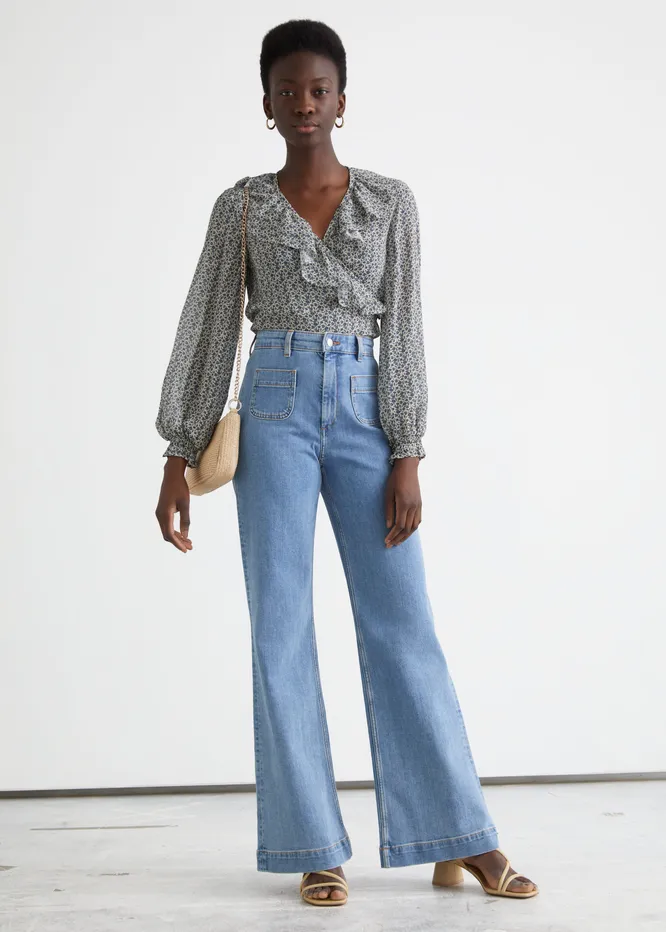 Тренд будущей осени — джинсы клеш с высокой посадкой в стиле 70-х. Дополняй их шелковой рубашкой или струящейся блузой с глубоким V-образным вырезом и обувью на платформе или массивном каблуке.