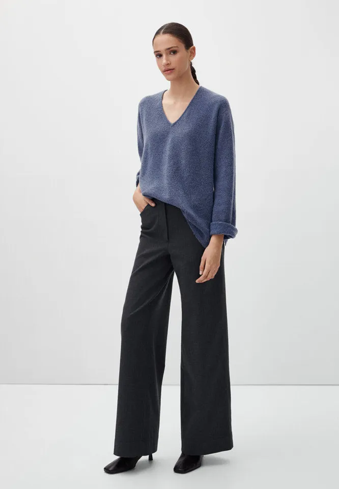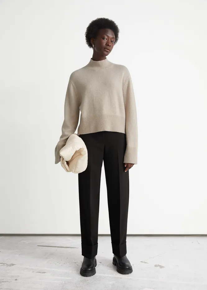 Модный лук на зиму-2022 с брюками и кардиганом свободного кроя. Чтобы образ не смотрелся слишком мешковато, расставь акценты при помощи лаконичной пары обуви на грубой подошве и добавь небольшую сумку с жестким каркасом.