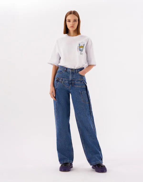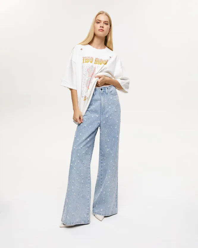 Расширяем категорию от просто джинсов с принтом до моделей в технике пэчворк и вариантов с «потертыми» узорами. Чем более странным выглядит деним, тем круче будет эффект!