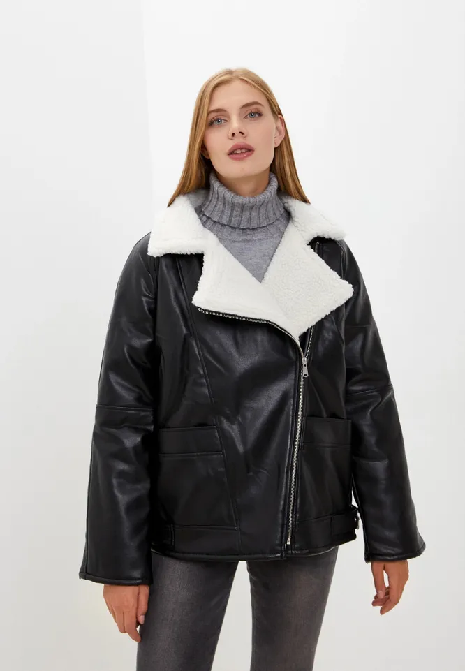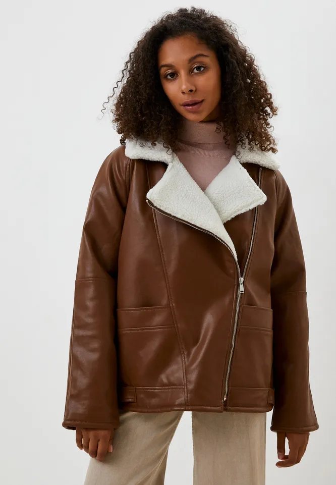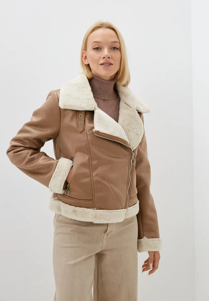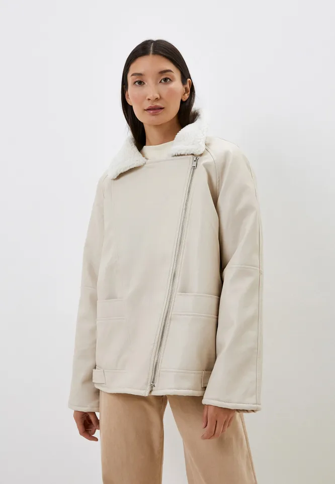 На фото представлена модная женская кремовая дубленка из искусственной кожи с подкладкой под овчину – отличный вариант для тех, кто не любит темную верхнюю одежду. Она освежит осенне-зимние образы и подойдет практически под любой аутфит. Ее можно надеть поверх брючного костюма, женственного платья, свитера и мини-юбки, трикотажного костюма, джинсов и свитшота. В качестве аксессуаров выбирай шапку крупной вязки, кашемировый шарф, кожаные перчатки и лаконичную сумку через плечо.