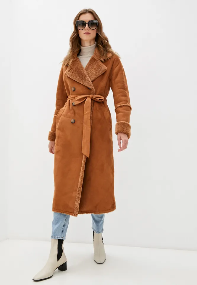 В 2022 году модные тенденции представляют женские дубленки, которые станут достойной альтернативой громоздким шубам. Вариант длины миди или макси. Наш первый фаворит – двубортная модель сочного коричневого оттенка с классическим английским воротником. Стильно смотрится как с классическими брюками и элегантными платьями, так и с расслабленными трикотажными джоггерами и базовыми джинсами. Дополняй ее светлыми аксессуарами, например, белым шарфом, фактурными перчаткам и сумкой из тисненой кожи или замши.