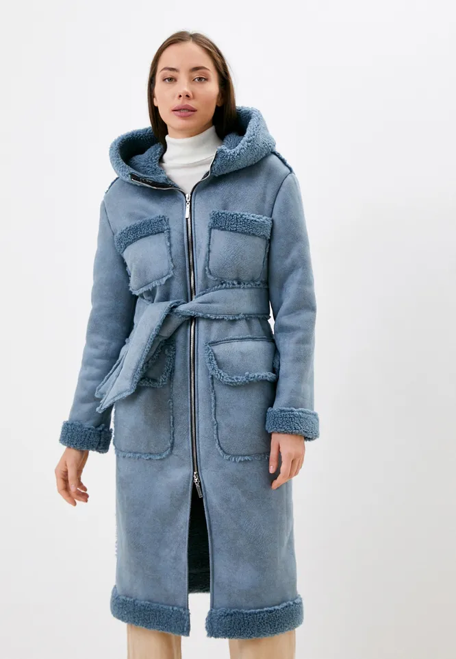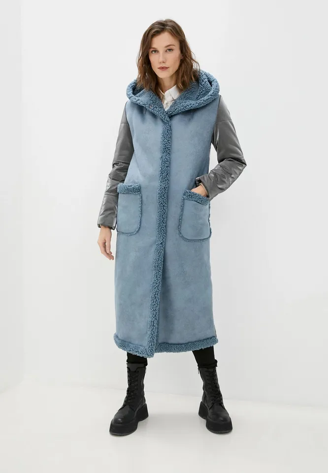 Поклонницам скандинавского минимализма в одежде предлагаем интересную голубую дубленку из искусственной кожи с внутренней стороной из овчины. Рукава и спинка выполнены из стеганого текстиля со слоем утеплителя. Оригинальности модели добавляют застежка на кнопки, накладные карманы и фиксированный капюшон. Накинь ее поверх уютного трикотажного костюма, дополни комплект зимними кроссовками или грубыми ботинками и меховой панамой – остромодный лук на каждый день готов. Если нужно что-то более элегантное, комбинируй дубленку со свитером, расклешенными брюками и ботильонами на платформе и массивном каблуке – получится актуальный образ в стиле 70-х.